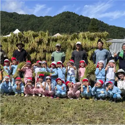 青年部の方に教えてもらいながら年長さんが稲刈りをしました。今年も豊作でした!