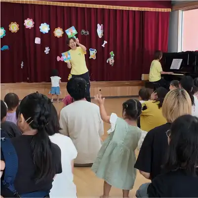 お兄さんお姉さんがかわいい衣装を着て踊ったり、元気に歌ったりします。ぜひ観に来てね!
